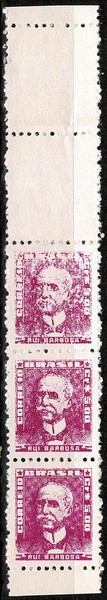 ** 513 – 5,00 Rui – Tira de 5 vertical, com total falta da impressão nos 2 primeiros selos, falhada no 3º e basicamente normal no 4º e 5º selo.