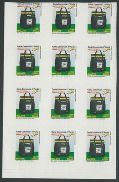 ** 849 – 1º Porte – Malote – Bloco de 12selos (3×4) vertical com enorme deslocamento do corte de destaque dos selos e só a marcação deles, ou seja, não há como destacar os selos, visto que não “perfurou” o papel, como se fosse uma batida “cega”. Aqui pedimos R$ 20 por selo.