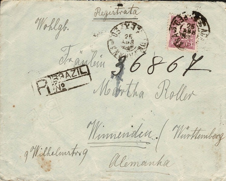 Ano 1927 – Envelope registrado circulado de Curitiba para a Alemanha, com chegada. Selo 1.000Rs Ruy em franquia isolada.
