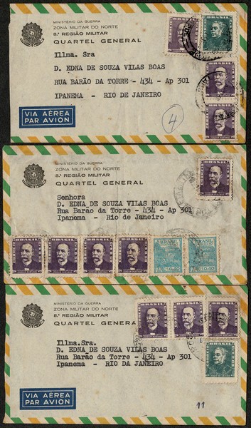 Ano 195 ? – 3 envelopes timbrados do Ministério da Guerra, 8ª Região Militar, circulados para o Rio de Janeiro e com a correspondência ainda dentro. 2 porteadas só com selos Bisneta e 1 misto com selos Netinha.