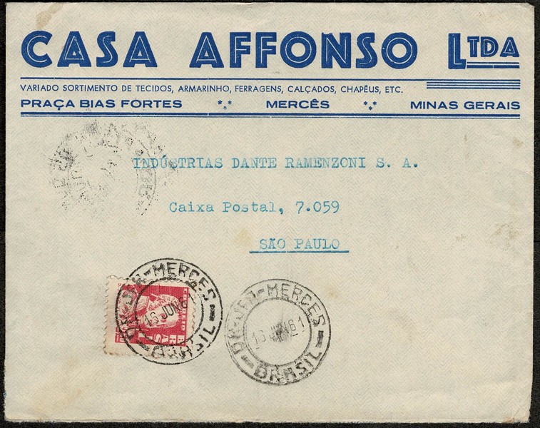 Ano 1961 – Envelope timbrado enviado da cidade de Mercês (MG) para São Paulo, com transito em Santos Dumont e porteado com selo 501a (2,50 D. João na cor carmin)