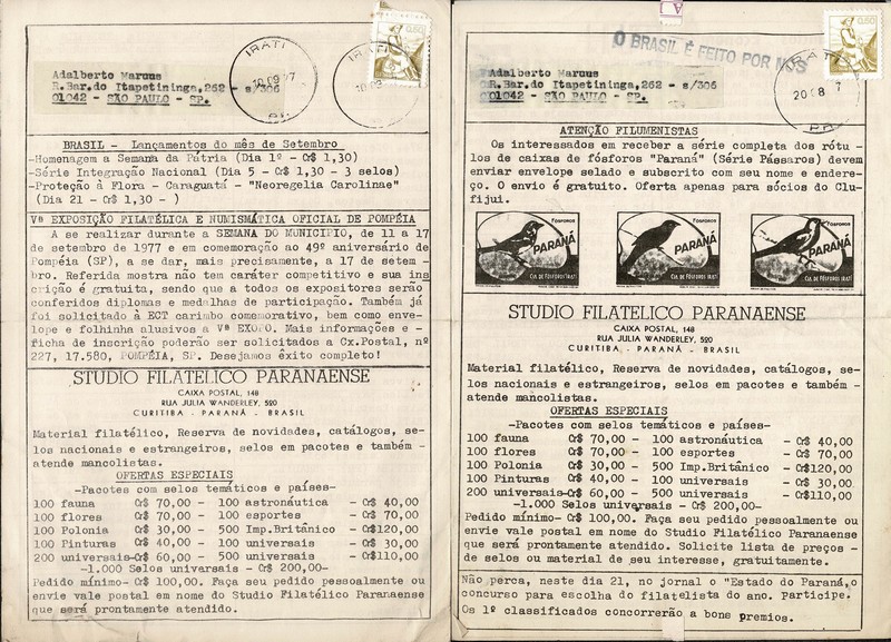 Ano 1977 – 2 diferentes Boletins Filatélicos CLUFIJUI (Irati-PR) circulados para São Paulo e ambos porteados com selo 0,50 Vaqueiro..
