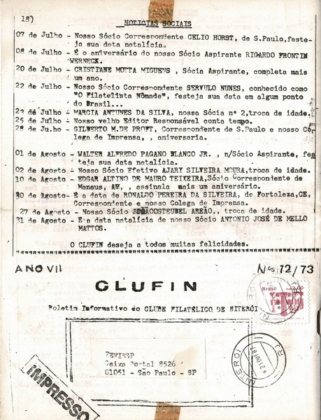 Ano 1987 – Boletim do Clube Filatélico de Niterói, circulado para São Paulo. Selo 2,00 Convento de São Francisco…