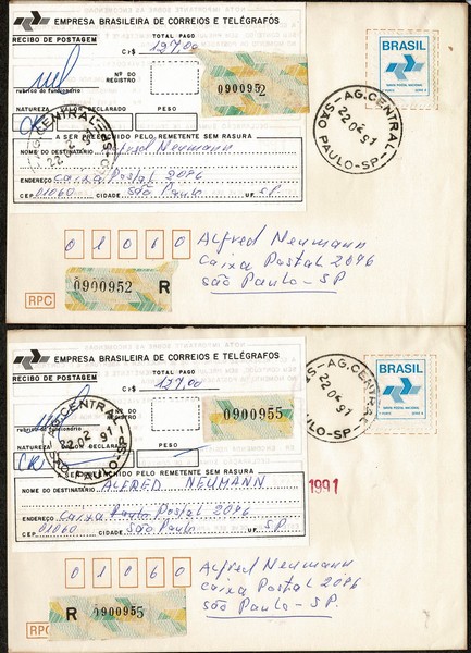 Ano 1991 – 2 Envelopes registrados circulados dentro da cidade de São Paulo com chegada. Ambas com etiqueta de registro # 675 selo do CF azul. Acompanha o devido registro com a outra parte afixada no comprovante