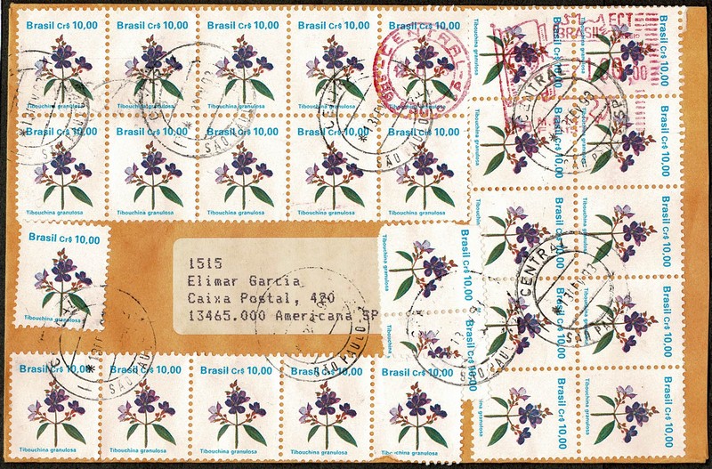 Ano 1993 – Envelope circulado de São Paulo para a Americana, com 28 !! selos O 679 + franquia mecânica, provavelmente por não ter lugar.