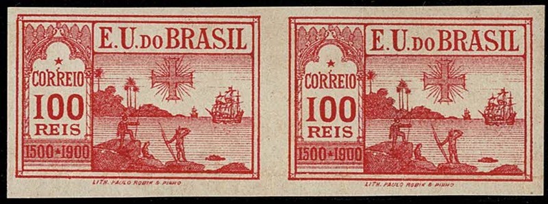 * 1SD – 100Rs Descobrimento. Par horizontal sem picote. Dobra horizontal inferior atravessando os 2 selos, só visível pelo verso – 1.300 UF.