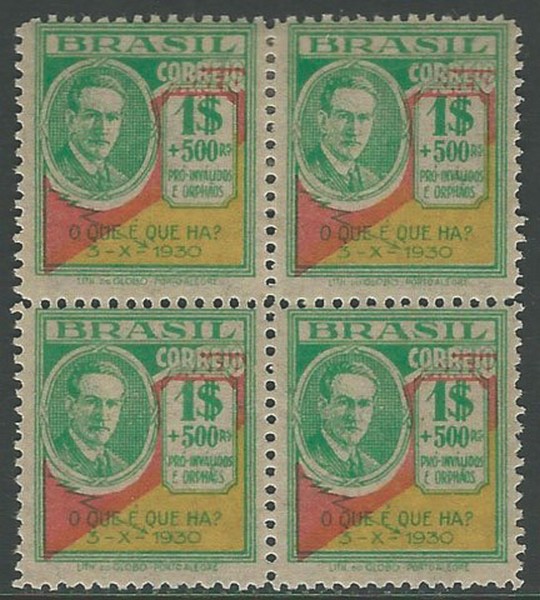**/* 37B – 1$000 Revolução de 30 – Quadra, 2 selos superiores * e os 2 inferiores ** com a impressão (cor vermelha) deslocada – 390 UF
