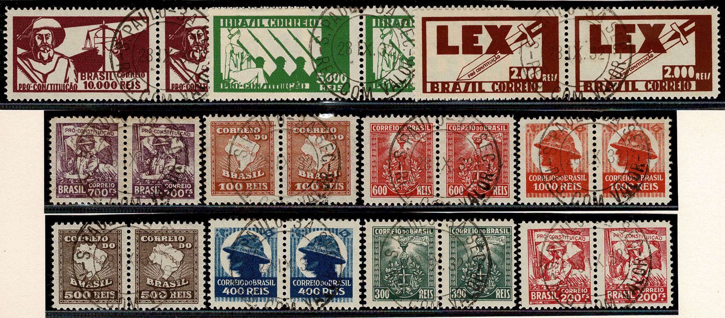 ◉ 46/56 – Revolução de 32 – Série completa em pares horizontal gomados e todos com o mesmo centrado carimbo: S.Paulo, Reg. com valor – 28.IX.32.