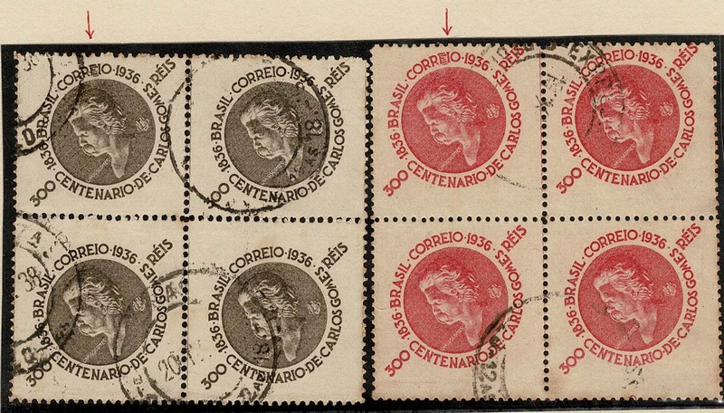 ◉ 106B e107A – Carlos Gomes – Ambos em quadras com carimbo comum e 1 selo na quadra com a variedade