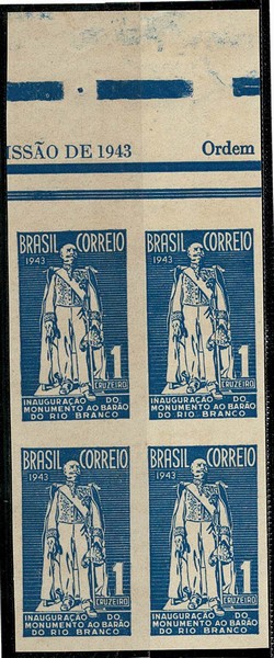 (*) 191 – Rio Branco – PROVA em quadra sem picote, papel liso, sem goma e filigrana. Cor definitiva. Margem superior de folha