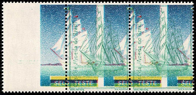 ** SELO TESTE – Figurando Caravela, indicação Casa da Moeda do Brasil. Provável ajuste de máquina. Trinca horizontal com variedade: Impresso nos 2 lados: um só na cor Rosa e no outro lado, multicolorido, além de enorme deslocamento horizontal das cores. Sem maiores informações a respeito da utilização deste “selo Teste”, que apareceu no mercado à cerca de 10 anos, com diversas opções de impressões/cores..