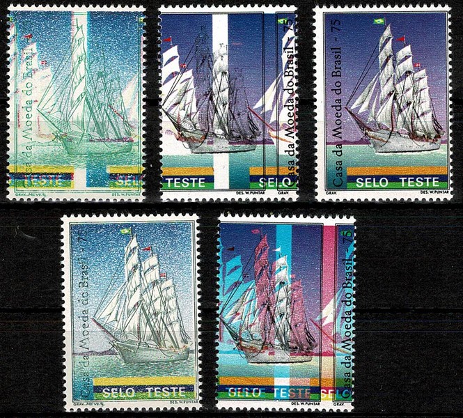 SELO TESTE – Figurando Veleiro, mas com inscrição Casa da Moeda do Brasil 75 – Ano 1975 ? Sem facial. Seria algum ajuste de máquina ou cor ? – 5 exemplares, com o mesmo desenho, mas com deslocamentos diversos, além de variações na impressão no verso.