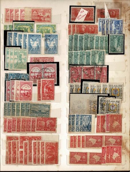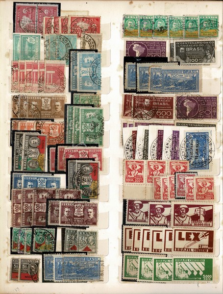 ESTOQUE DE SELOS COM e SEM CARIMBO – Estoque distribuído em folhas de classificador, contendo 2.175 selos SEM CARIMBO. Os selos usados (que são cerca de uns 500) não foram contados, embora tenham bons valores no meio, como C35 x 7 (350 UF) C40 x 6 (420 UF) C124 x 6 (840 UF) e C177A x 6 (450 UF) Só neste poucos itens temos 2.060 UF. Os selos sem carimbo começam na 1ª série e vem até o ano de 1993, sendo que do padrão Réis são 444 selos. Bem abastecido nos melhores anos 70. Os selos usados, basicamente vão só até o padrão Réis. Todos encaixados de forma ordenada. Também contempla o setor dos comemorativos aéreos. Vímos muitos valores medianos e melhores, como C7 x 4 (600 UF) C13Es (200UF) 13 valores dos 3 fechos da Revolução de 32 (925 UF) Cairu x 3 quadras, alguns papéis finos, diversas séries em papel cartão da Vitória. Os selos sem carimbo, estão nas 3 qualidades: Sem goma, com ela alterada de alguma forma e com ela absolutamente plena. Certamente vários milhares de unidade filatélicas.