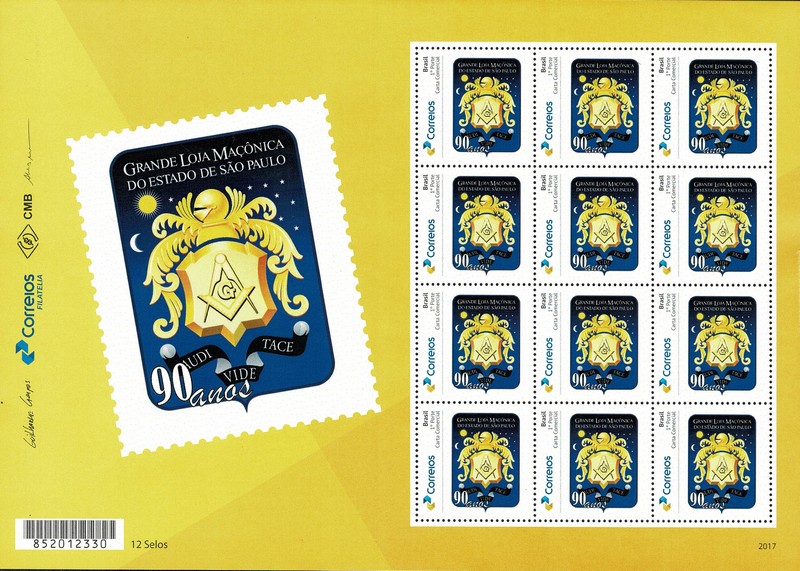 ** Personalizado Básico – Ano 2017 – 90 Anos da Grande Loja Maçônica do Estado de São Paulo. Sentido horizontal. Lote com 5 folhas completas x 12 selos em cada. Aqui saindo à R$ 24 por folha, que é abaixo do seu facial e muito abaixo do seu custo atual, que é em torno de R$ 40