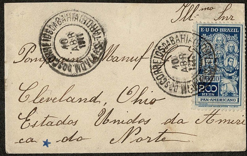 Ano 1911 – Envelope circulado da Bahia para os Estados Unidos. Selo 9 (Próceres Panamericanos) Falta parte da aba do fechamento