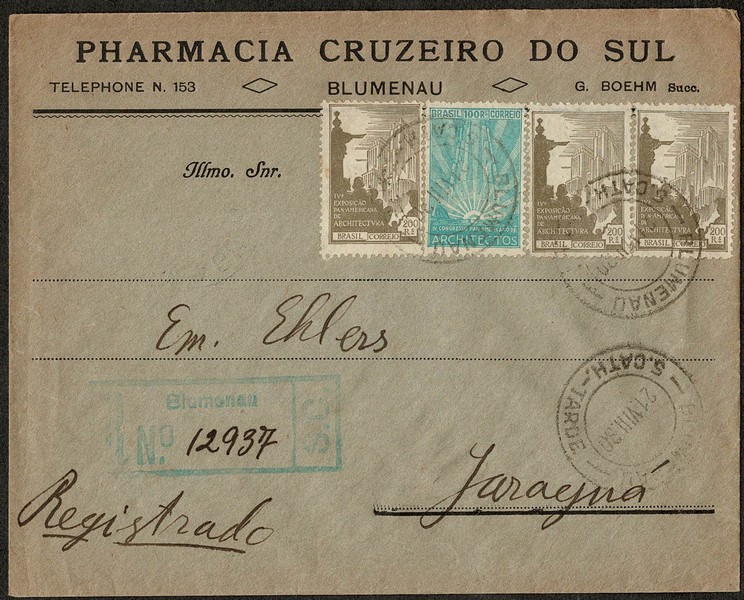 Ano 1930 – Envelope registrado circulado de Blumenau (carimbo verde) para Jaragua, com chegada. Selos 100rs e 200Rs x 3 (série arquitetos) fazendo 700Rs de porte. Correto ? Bem limpo….