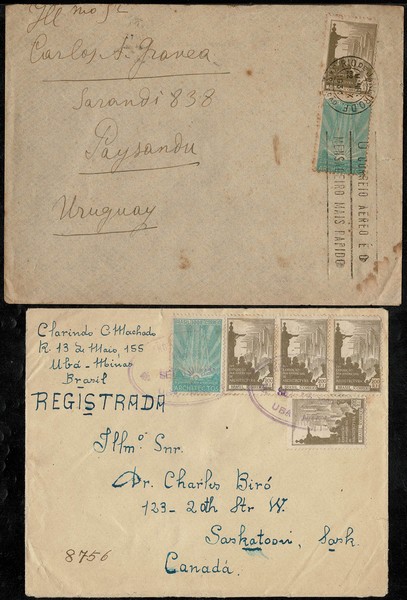 C24/25 (Congresso de Arquitetura) Ano 1930 – 2 envelopes circulados, sendo um registrado, de Ubá (MG) para o Canadá, com porte de 900 Réis, carimbos de transito e chegada e o outro do Rio de Janeiro para o Uruguai com porte de 300 Réis, refilado na parte superior.