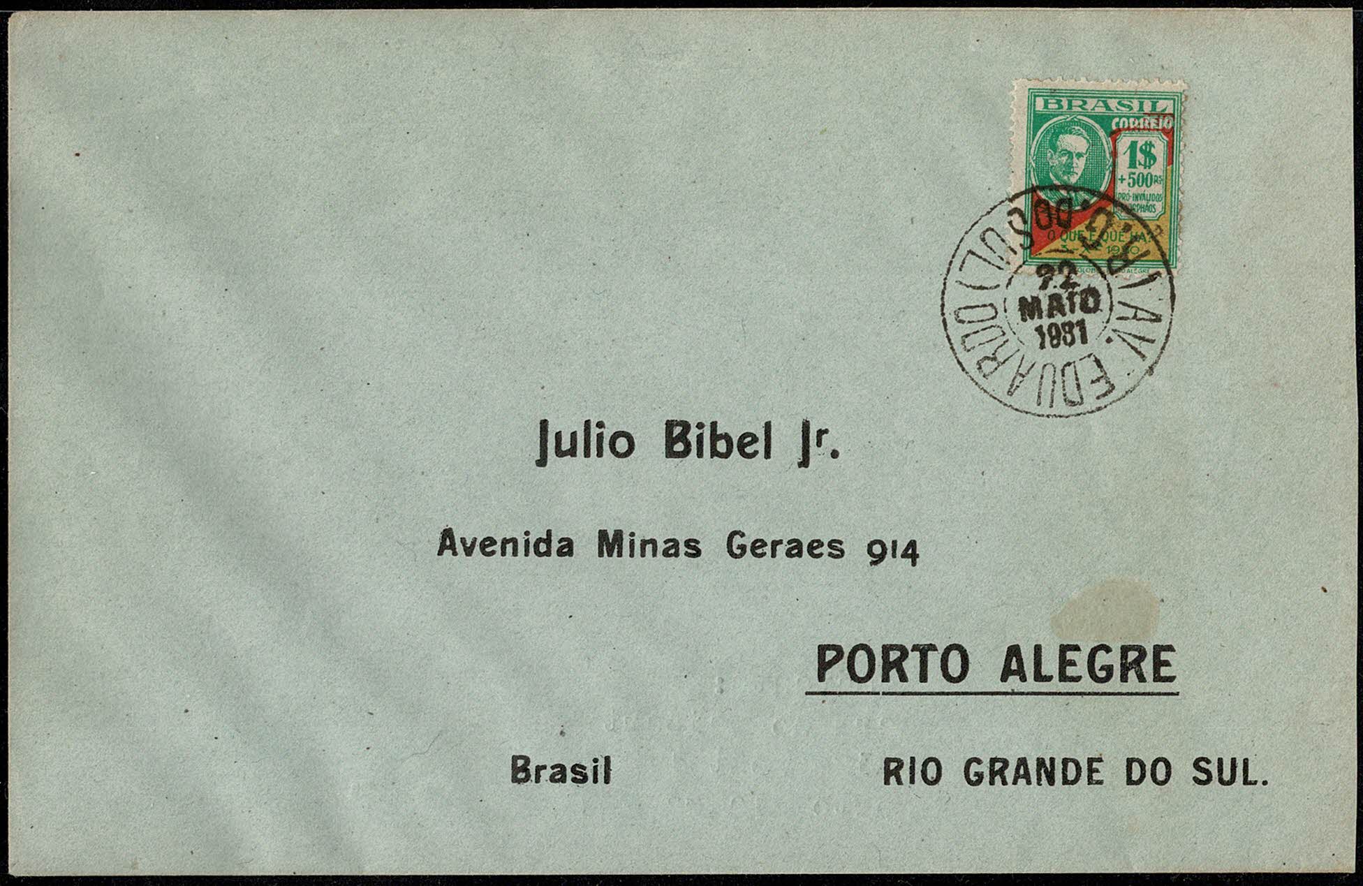 Ano 1931 – Envelope circulado dentro de Porto Alegre com selo C37 (1$000 Revolução de 30) em franquia isolada.