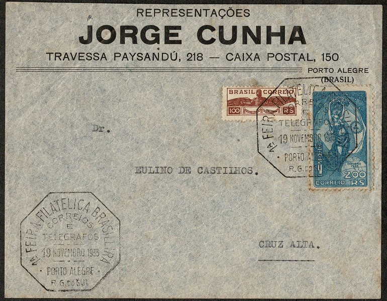 Ano 1933 – Envelope timbrado circulado de Porto Alegre para Cruz Alta, com chegada. Selo 60 (200Rs Presidente Justo) 64 (Pró Aeroportos) Leves pontos de ferrugem – 290 UF
