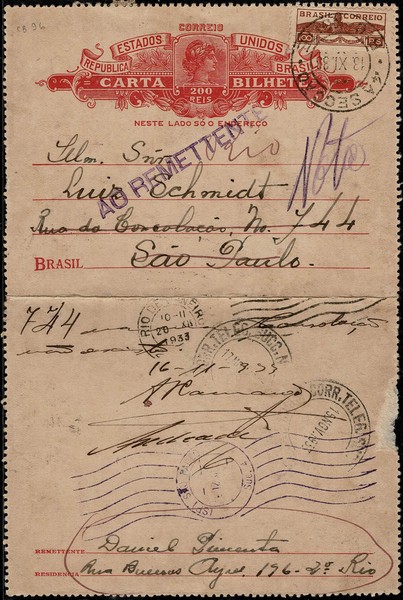 Ano 1933 – Inteiro Postal Carta Bilhete CB96 (200Rs) selo C65 (Pró Aeroportos) com data 13.11, circulado do Rio de Janeiro para São Paulo com chegada e posterior devolvido, com diversos carimbos