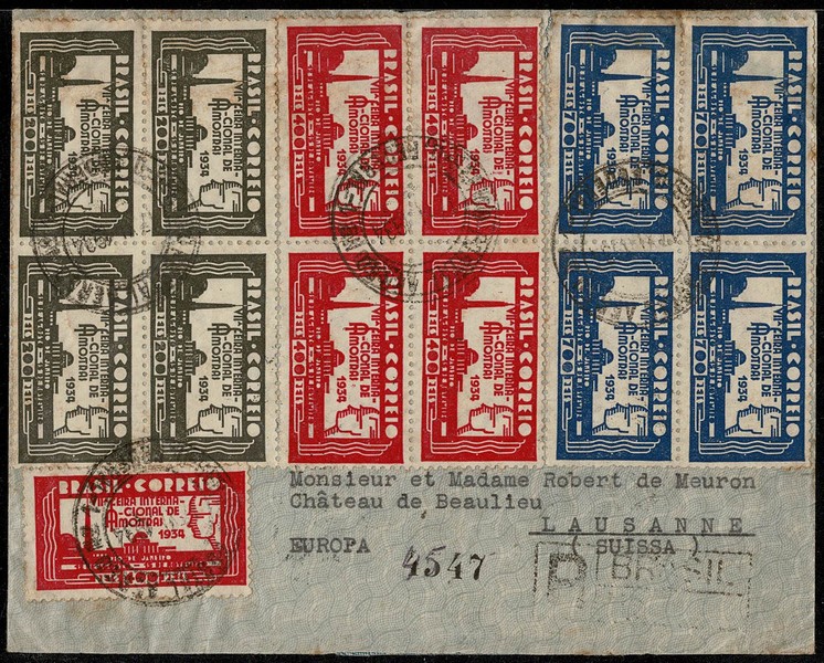 Ano 1934 – Envelope registrado com porte de 5.600 Réis (4.200 Réis do 5º Grupo + 1.400 Réis do registro aéreo) circulado do Rio de Janeiro para a Suíça, com carimbo de transito + chegada. Porteado só com selo da 7ª feira de amostras do Rio de Janeiro (C 66/68) assim dividido pelos faciais: 200Rs (quadra) 400Rs (quadra + selo isolado) e 700Rs (quadra)