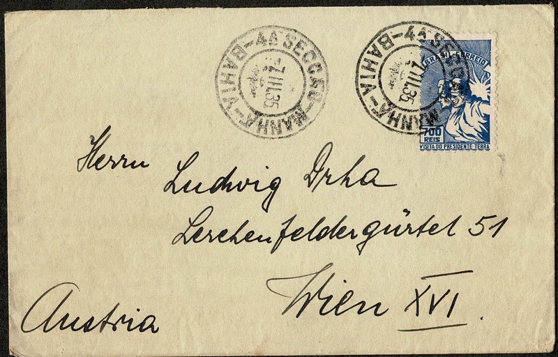 Ano 1935 – Envelope circulado da Bahia para a Austria. Franquia isolada selo 84 (700Rs Presidente Terra) – 290 UF