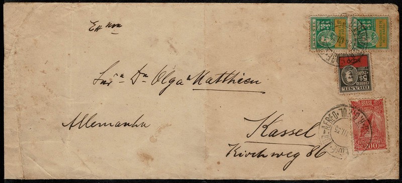 Ano 1935 – Envelope circulado de Porto Alegre para a Alemanha. Porte de 25.200 Réis (alusivo ao 5º porte aéreo para a Europa) Selos: 5$000 (isolado) + par do 10$000 da Revolução de 30 + selo aéreo. No verso, carimbo do Serviço Transoceânico da Condor. Peça com vinco central e lateral.