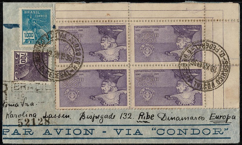 Ano 1936 – Envelope registrado circulado do Rio de Janeiro para a Dinamarca, com chegada. 2 selos regulares quadra selo C94 (1.000Rs Farroupilha) afixado de ponta cabeça