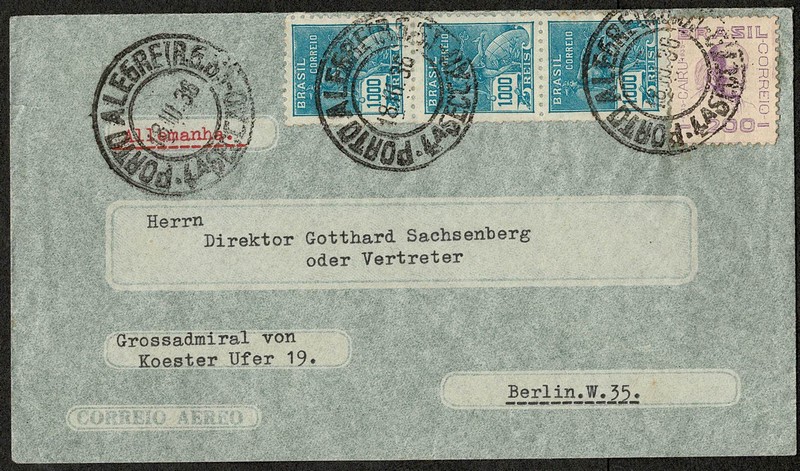 Ano 1936 – Envelope circulado de Porto Alegre para a Alemanha. Selo 102 (Cairú) 3 selos vovó, fazendo o porte de 4.200Rs. Correto ? Bem limpo.