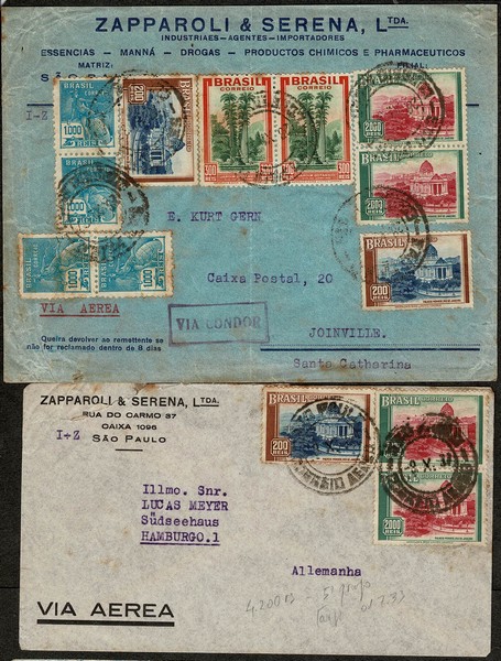 Ano 1937 – 2 Envelopes circulados com selos da série Turismo: Um deles com 200Rs x 2, 300Rs x 2, 2.000Rs x 2 + 4 selos vovó, circulado de São Paulo para Joinville com chegada com 9.000Rs de porte e vinco central atingindo 1 selo e o outro com 4.200 Rs de porte em 2x 2.000Rs + 200Rs, circulado de São Paulo para a Alemanha- peça com pontos de ferrugem.