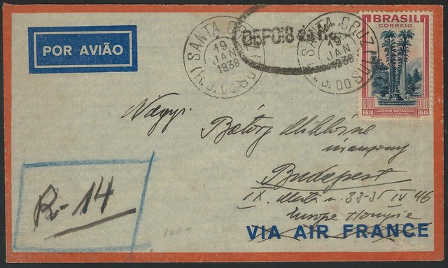 Ano 1938 – Envelope registrado, circulado de Santa Cruz (RS) data 19.Janeiro, para a Hungria, com carimbo de chegada. A peça tem um vistoso carimbo “Depois da Hora” na parte frontal. Franquia isolada selo 124 (10$000 Turismo) 6.000 UF !!