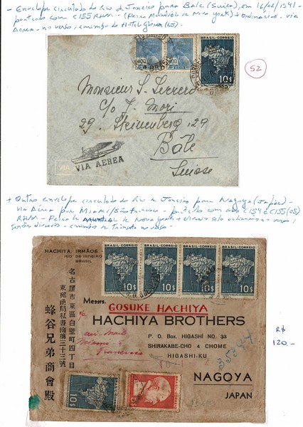 Anos 1940 e 1941 – EMISSÃO FEIRA DE NOVA YORK FACIAL 10$000 – 2 envelopes montados em folha do tamanho A4 e com descrição manual. Um fazendo o porte de 10$800Rs , indo do Rio de Janeiro para a Suiça com selo alusivo + par vovó e o outro, também do Rio de Janeiro, agora para o Japão, registrado, com 5 selos alusivos + o facial de 5$000 da mesma série. Vide imagem