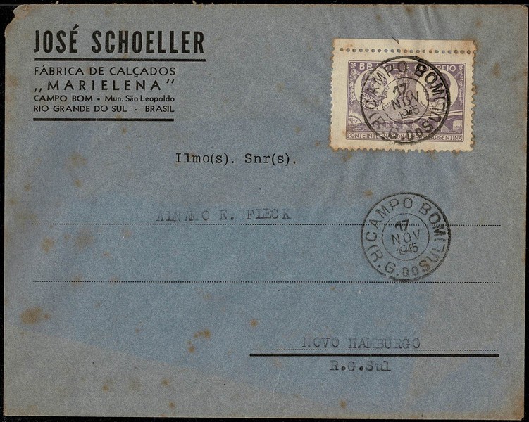 Ano 1945 – Envelope circulado com data 17.11.45, de Campo Bom para Novo Hamburgo, com chegada. Selo C213 (Ponte Internacional) Peça com pontos de ferrugem.