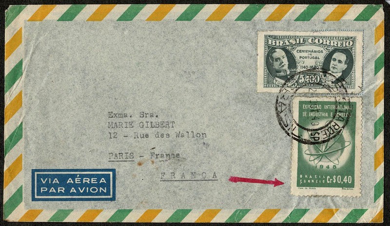 Ano 1949 – Envelope circulado de São Paulo para a França. Selos : 167 (Cent. Portugal) + 237A (Exp. Indústria, com variedade Çorreio).