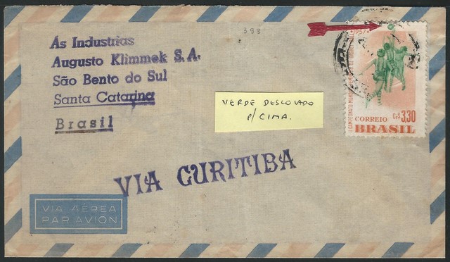 Ano 1957 – Envelope circulado do Rio de Janeiro para São Bento do Sul (SC) Selo 393 (Basket) com visível deslocamento da cor verde (Jogadores) para cima, ficando a bola na margem superior. Peça com vinco vertical central.