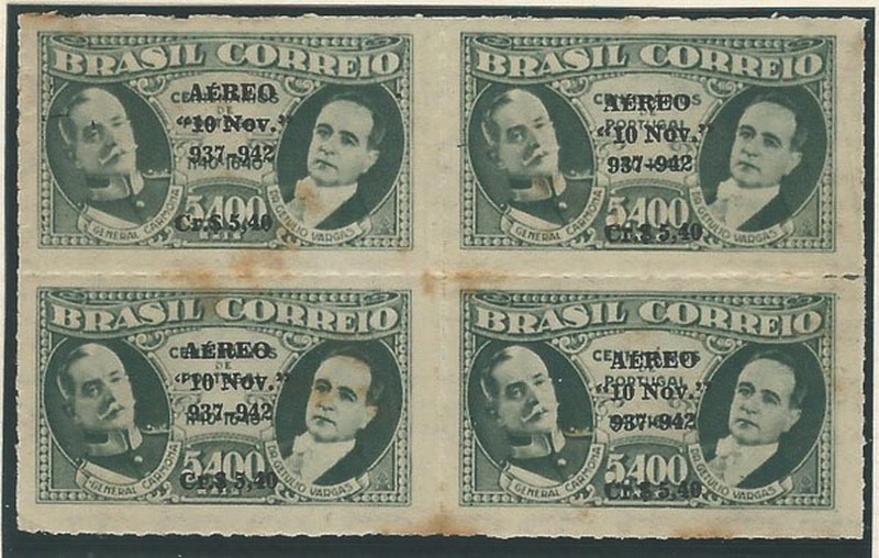 * 45 I – Estado Novo – Filigrana Correinho. Quadra com ferrugem acentuada -1.300UF = Cerca de R$ 7.100..