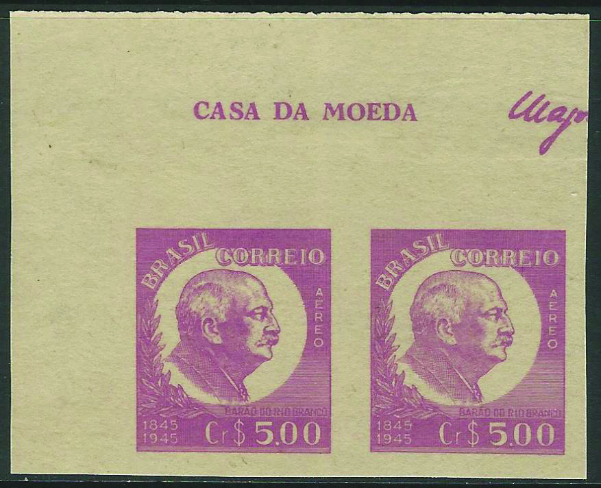 ** (60BSP) – 5,00 Barão do Rio Branco – Par horizontal sem picote e sem filigrana. Canto superior de folha. Ambos expertizados Kessler. Não catalogado sem picote. Cada selo picotado marca 240 UF (Cerca de R$ 1.300)…