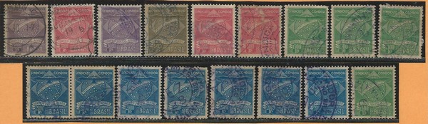 ◉ 1ª Série – CARIMBOS DE COR – 15 selos, de 5 diferentes faciais, apenas 1 em azul, demais em Roxo/Violeta carimbo Berlin (facial 3$000) e Hamburg Sudamerika (facial de 1$000).Lote 0774 da nossa 70ª VSO, agora oferecido com 20% de desconto