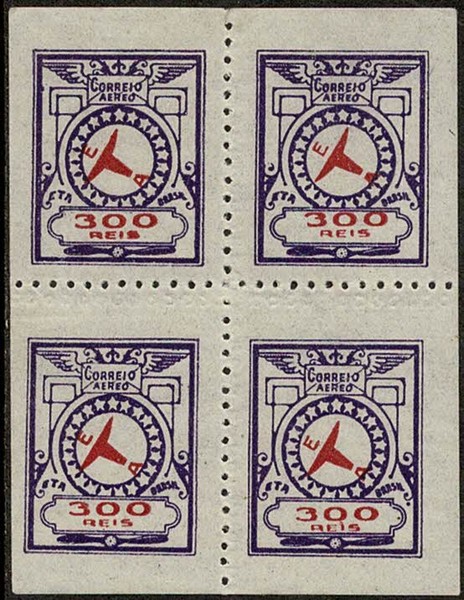 ** 11 – 300Rs – 3ª tiragem – Folha com 4 exemplares absolutamente ** e variedade só visível pelo verso: Dupla batida do pente horizontal, sendo uma sem perfurar – 700UF ++.