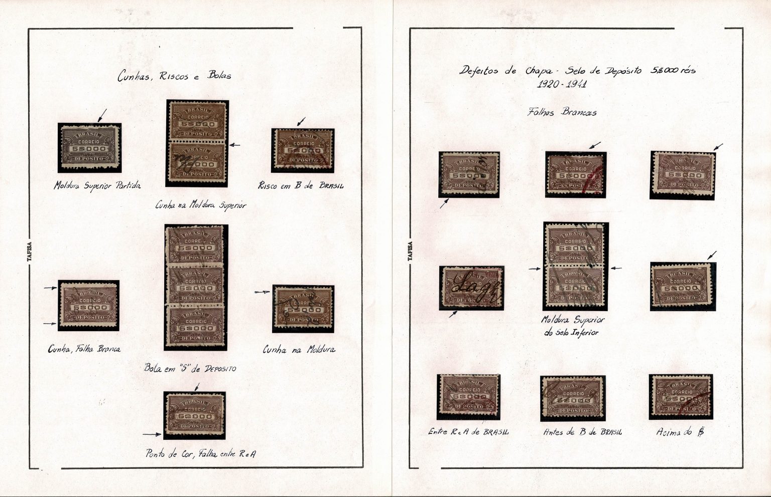 ◉ DEFEITOS DE CHAPA – Conjunto montado em folhas com 16 itens, todos com a variedade anotada e todos também do facial 5$000 que não foi separado pelas filigranas.