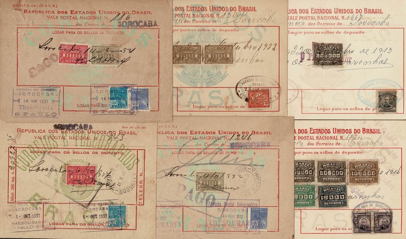 SOROCABA (SP) Anos 1913 a 1937 – Lote com 6 Vales Postais, sendo 4 deles com DIFERENTES carimbos da Adm. dos Correios. Os 3 dos anos 10, tem o mesmo carimbo, mas em cores DIFERENTES. Selos diversos, entre Próceres e Vovó. O do ano 1937 é filigranado