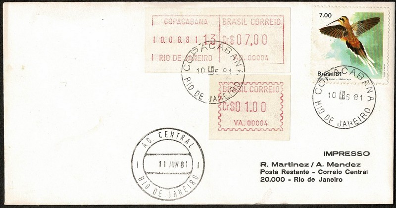 Ano 1981 – Envelope circulado dentro do Rio de Janeiro. Selo comemorativo SE 2 (facial de 1,00) e SE 3 (facial de 7,00) ambos da Agencia VA 00004 (Copacabana) com carimbo de 1° Dia (10.06)..