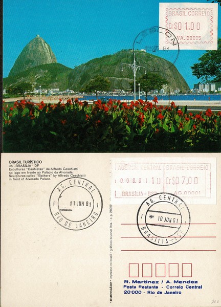 Ano 1981 – 2 Cartões tipo “Máximo” com etiquetas SE 3 no endereçamento (facial 7,00 – Agências 00001 e 00006) e na parte ilustrada SE 2 (no facial de 2,00) ambas circuldas para o Rio de Janeiro com carimbo de 1º dia (10.6) e com chegada no dia seguinte (11.6) Saídas de: Brasilia e Leblon (RJ).