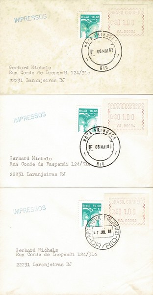 Ano 1983 – 3 Envelopes impressos saindo de Nova Friburgo (RJ) datas 6.5 x 2 e 1 com data 7.7, para o Rio de Janeiro, todos com SE 2, Agência 00004 no facial de 1,00 selo Recursos Econômicos de 10,00. O porte de 11,00 está correto ? Um deles com pontos de ferrugem..