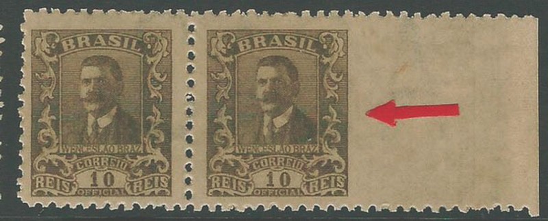 ** 30 – 10Rs Wenceslau Braz – Par horizontal, ficando o selo direito sem o picote vertical. Margem de folha e segundo consta só existem 5 exemplares desta maneira, originários de uma única folha e que foi aberta à alguns anos atrás. A origem é a mesma do lote anterior.