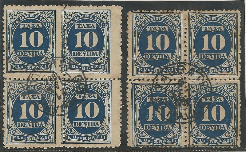 ◉ 18 – 10Rs – 2 quadras com centrados carimbos: Cid. de Jahú e Taubaté – Ambos 100%…