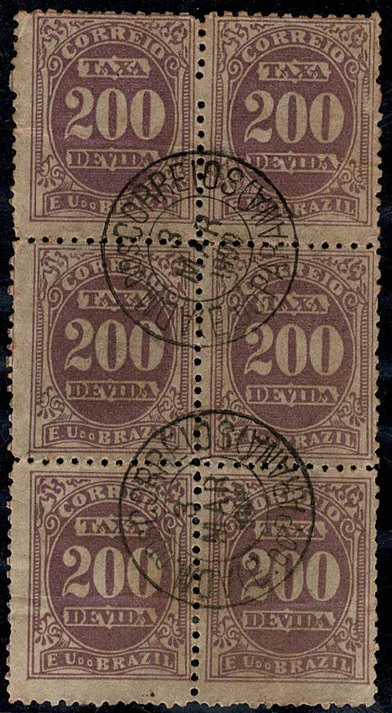 ◉ 22 – 200Réis – Sextilha vertical com duplo carimbo da Adm. dos Correios (PR) 3.Mar.1900 .