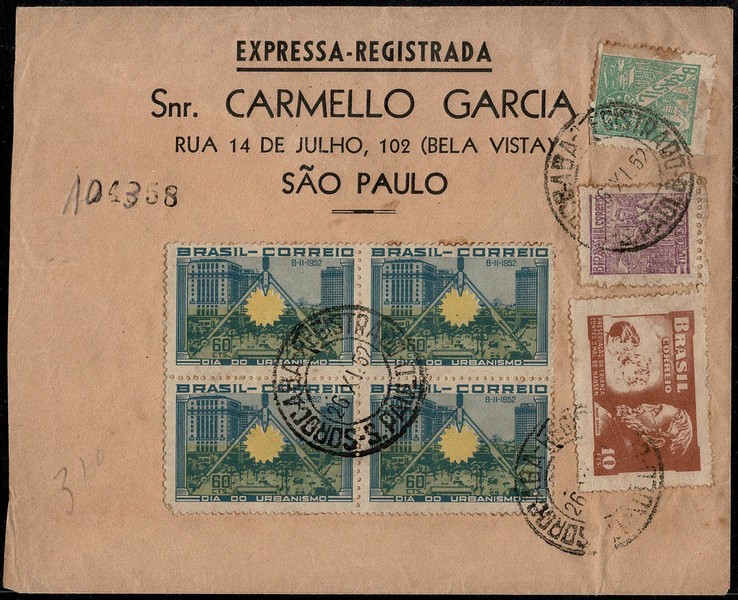 Ano 1952 – Envelope expresso, registrado, circulado de Sorocaba (SP) para São Paulo. Quadra selo C287 (Urbanismo) 2 selos Netinha H1 com data 26.11.1952