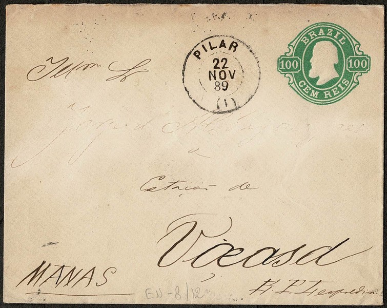 8 – 100Rs – Ano 1889 – Circulado de Pilar (AL) com data 22.Nov (1 semana após a Proclamação da República) para Viçosa (MG) com carimbo de transito chegada no Rio. Nome do destinatário apagado e destino rasurado.