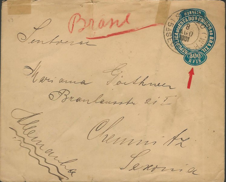 49 – 300Rs – Ano 1901 – Circulado de São Paulo para a Alemanha com chegada. Alguns reparos com charneira na parte superior. Variedade : “RFIS” no lugar de “REIS”…